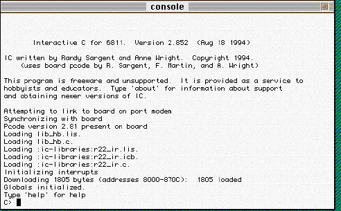 In the above window, as a result of launching the application, the software first tries to make contact with the Handy Board. If the Handy Board is turned ON, IC will synchronize with it. It will also load additional program libraries before giving the prompt (>C).